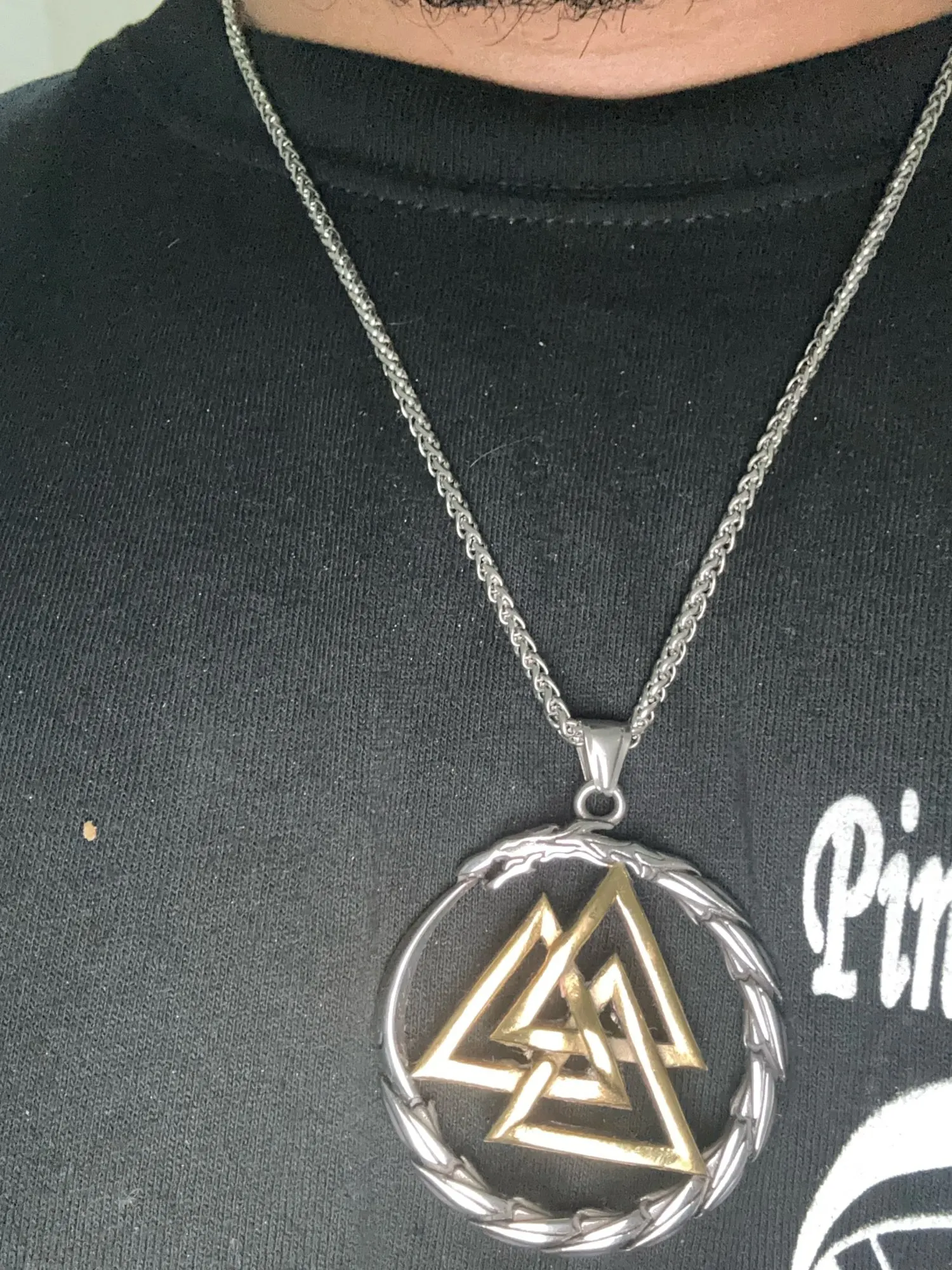 Il présente un pendentif du symbole de la trinité, amulette viking de protection et de guidage, ainsi qu'un dragon Ouroboros, symboles d'éternité et de force
